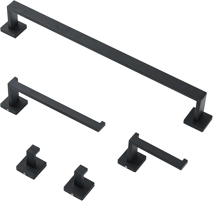 - 5-Piece Set: Includes a 24'' towel bar, 10'' towel holder, toilet paper holder, and 2 towel hooks.